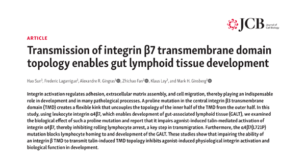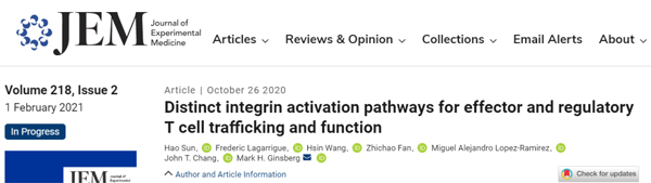 2020年10月27日,加州大學(xué)圣地亞哥分校醫(yī)學(xué)院,聯(lián)合法國(guó)圖盧茲大學(xué)和康涅狄格大學(xué)衛(wèi)生院的科學(xué)家在Journal of Experimental Medicine(JEM) 上在線發(fā)表了題為Distinct Integrin Activation Pathways for Effector and Regulatory T cell Trafficking and Function的工作(第一作者為孫昊博士)?! ?/p>