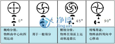 三次元旋振篩,由直立式電機(jī)作激振源,電機(jī)上端安裝偏心重錘(基準(zhǔn)塊),下端安裝可調(diào)節(jié)偏心塊,如下圖所示,當(dāng)兩側(cè)偏心塊向中間合攏,振幅變?。划?dāng)偏心塊向兩側(cè)分離,振幅變大。通過調(diào)節(jié)偏心塊的位置將電機(jī)的旋轉(zhuǎn)運(yùn)動轉(zhuǎn)變?yōu)樗?、垂直、傾斜的三次元運(yùn)動,通過調(diào)整下端兩偏心塊的夾角大小來控制振幅,把這個運(yùn)動傳遞給篩面調(diào)節(jié)下端偏心塊的相位角,可以改變物料在篩面上的運(yùn)動軌跡。